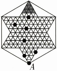 9. 如图,跳棋盘格点上的黑色点为棋子,剩余的格点上没有棋子.现约定跳棋游戏的规则:把棋子在棋盘内沿直线隔着其他棋子对称跳行,跳行一次称为一步.已知点A为己方一枚棋子,欲将棋子A跳进对方区域(阴影部分的格点),则跳行的最少步数为(