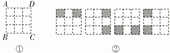 4. 图①是$3×3$的正方形方格,将其中两个方格涂黑,并且使涂黑后的整个图案是轴对称图形,规定绕正方形$ABCD$的中心旋转后能重合的图案都视为同一种图案. 如图②中的四幅图就视为同一种图案,则能得到的不同图案共有(