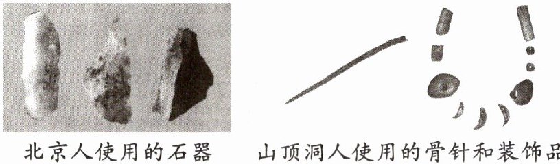 (1)北京人把石块敲打成粗糙的石器,制作方法简单;山顶洞人虽然仍然使用打制石器,但已经掌握磨光和钻孔技术。