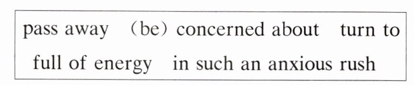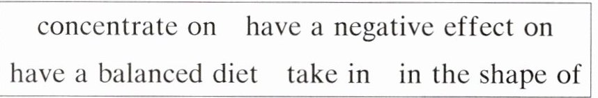 1. concentrate on 2. have a negative effect on 3. take in 4. in the shape of 5. have a balanced diet 6. passed away 7. concerned about 8. full of energy 9. turn to 10. in such an anxious rush