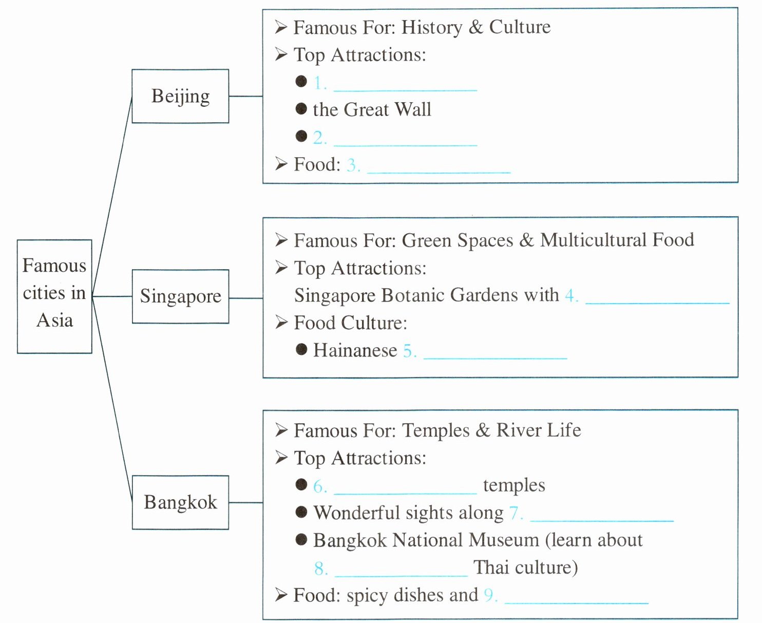 一、1. the Palace Museum 2. the Summer Palace 3. Beijing roast duck 4. unusual plants 5. chicken rice 6. Hundreds of 7. the river 8. traditional 9. fruits