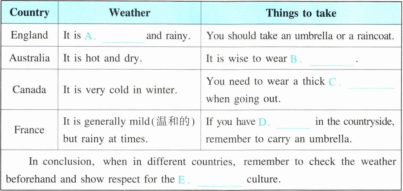 On sunny days, people usually 22 happy and active. On cloudy days, they may be 23 or less excited. Animals also react to weather 24 : birds sing less on windy days, and ants hurry to find a safe place before rain.
