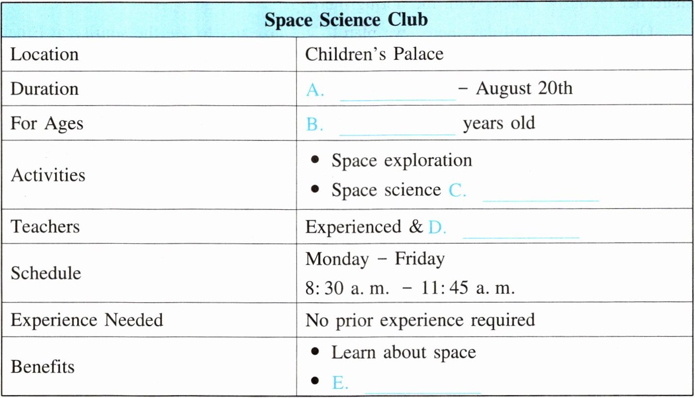 A. July 10th. B. 6-18 C. experiment classes D. friendly E. make new friends