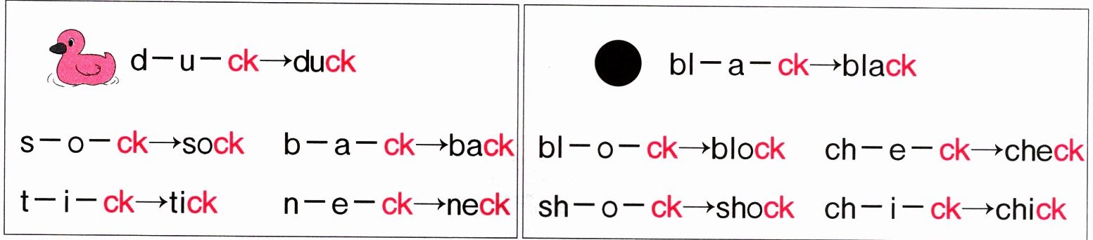 duck, sock, back, tick, neck, black, block, check, shock, chick.