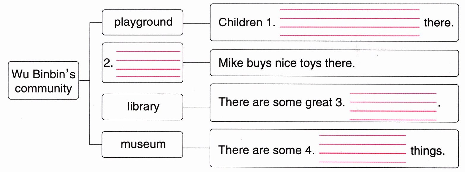 Wu Binbin's community is nice. My favourite place is the park. In the park, there is a playground. Children play games there. There is also a toy shop. I buy nice toys there. There is a library. It is not very big, but there are some great books in it. There is a small museum too. There are some old things. People can read stories about them.