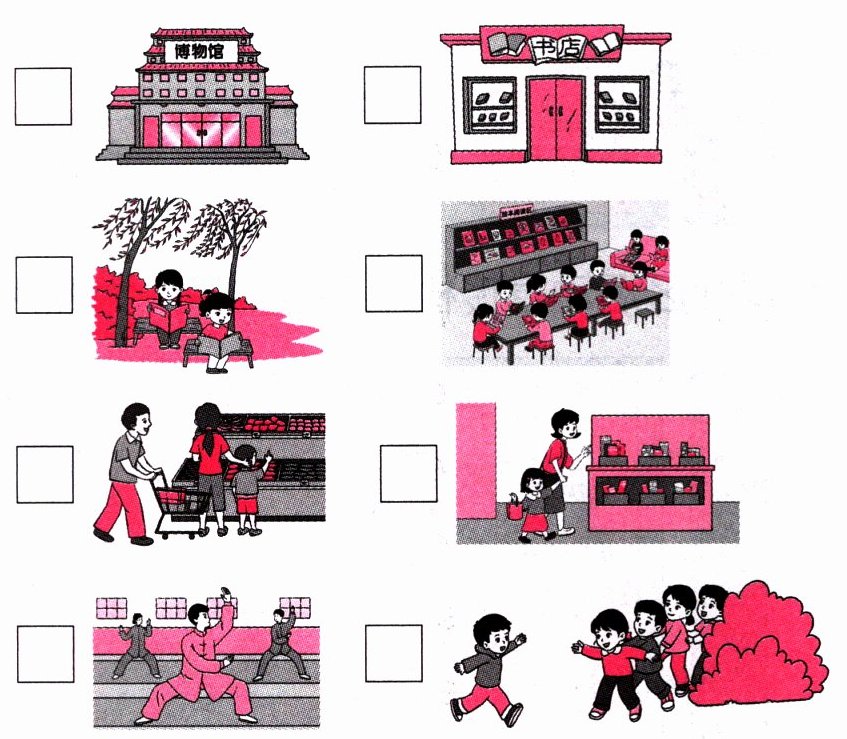 任务一:圈出第一、三、四、六幅图 任务二:1. play games 2. toy shop 3. books 4. old