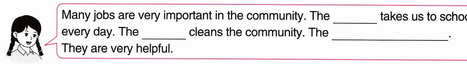 Many jobs are very important in the community. The bus driver takes us to school every day. The cleaner cleans the community. The firefighter protects everyone's safety. They are very helpful.