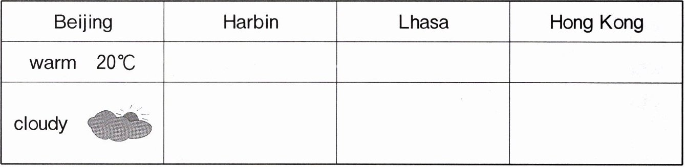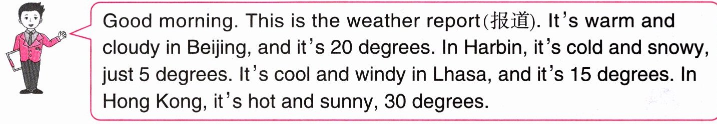 Good morning. This is the weather report(报道). It’s warm and cloudy in Beijing, and it’s 20 degrees. In Harbin, it’s cold and snowy, just 5 degrees. It’s cool and windy in Lhasa, and it’s 15 degrees. In Hong Kong, it’s hot and sunny, 30 degrees.