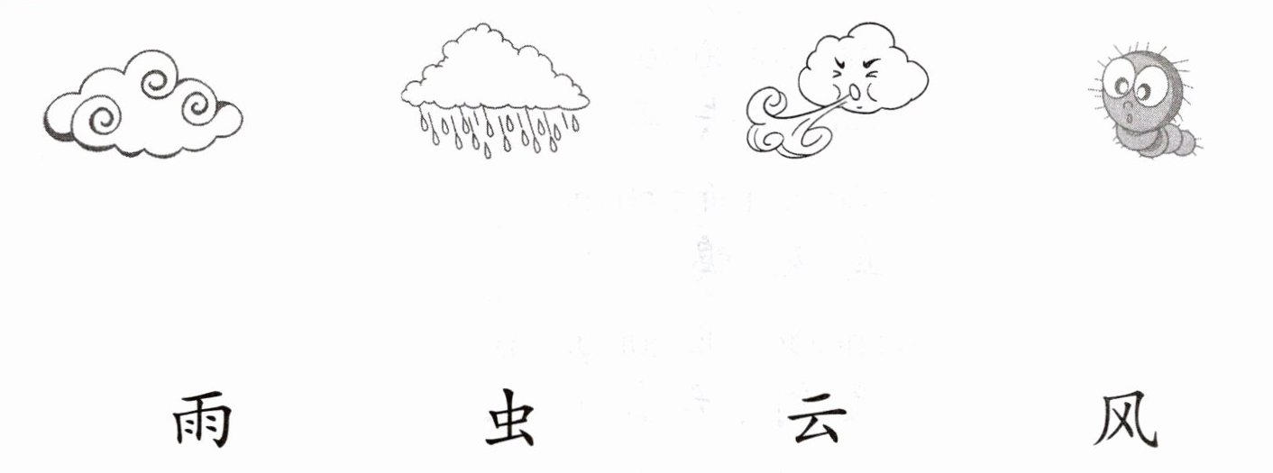 从上到下,第一幅图连“云”,第二幅图连“雨”,第三幅图连“风”,第四幅图连“虫”。