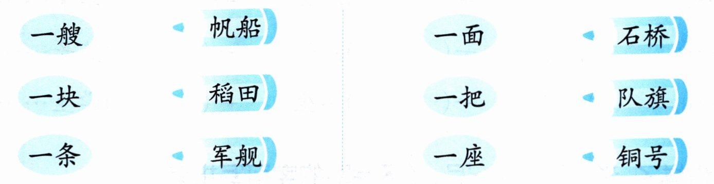 一艘—军舰;一块—稻田;一条—帆船;一面—队旗;一把—铜号;一座—石桥