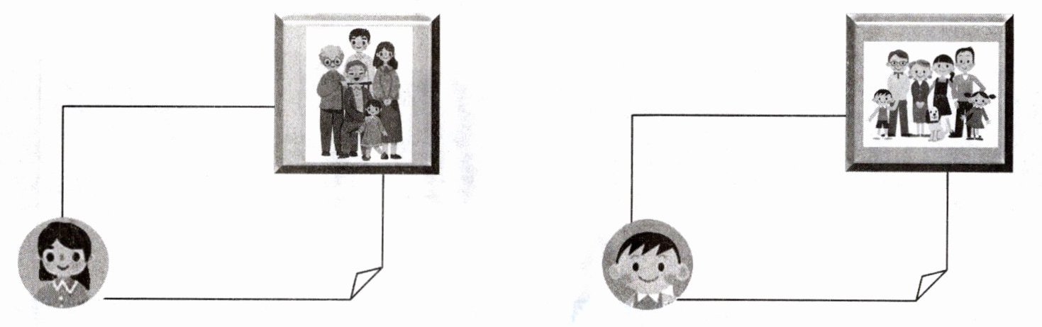 Ⅰ. Look and choose. (欣欣和晨晨在向同学们介绍自己的全家福,他们会用到哪些句子呢?将序号填在相应的方框内。)