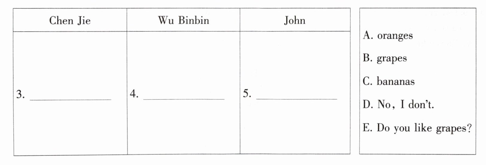 Ⅱ. Read and fill.(读一读,补全对话,并选出几位同学各自喜欢的水果。)