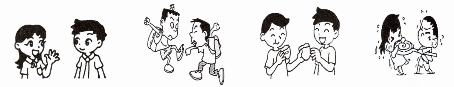 Ⅱ. Look, judge and choose.(看图,判断图片人物相处方式是“√”否“×”恰当,如不恰当请选择合适的建议,将序号写在横线上。)