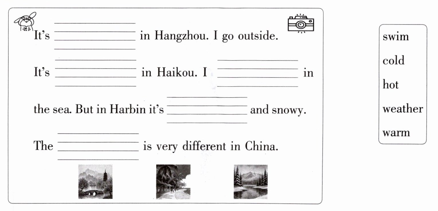 Ⅱ. Look, choose and write.(看图,选择合适的词语完成朋友圈文案并写在四线三格中。)