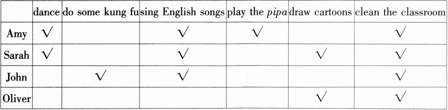 | | dance | do some kung fu | sing English songs | play the pipa | draw cartoons | clean the classroom |