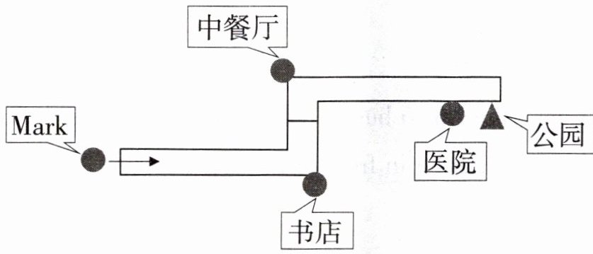 2. 图中显示 Mark 到达中餐厅后是直走,而不是左转,与句子“He can turn left when he arrives at the Chinese restaurant.”描述不符,所以该句错误,填F。