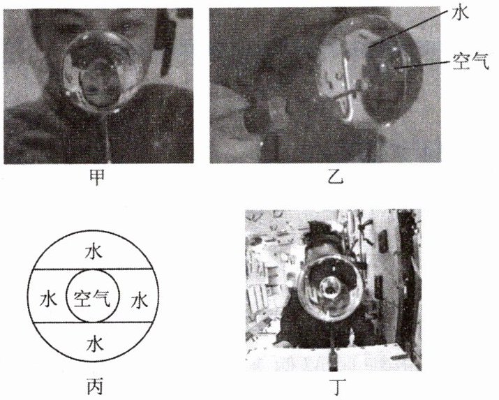 在水球光学实验中,王亚平老师利用金属圈和水袋做成了一个水膜,然后往水膜注水,让它变成一个大水球,如图甲所示。此时透过水球可以看到倒立、缩小的①______像;接着,王老师向大水球中间注入一个大气泡,如图乙所示。因为在太空中浮力几乎消失,所以气泡不会向上飘,而是老老实实待在水球中。水球由两部分组成,中间是空气,气泡周围是水,如图丙所示,此时,整个水球就相当于两个透镜,外圈是②______透镜,内圈是③______透镜。通过水球可以看到王老师的两个像:一个是倒立缩小的像,另一个是正立缩小的像,如图丁所示。