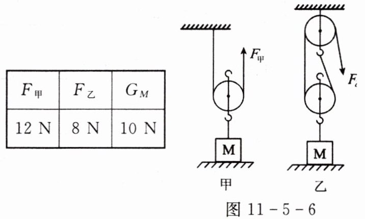 13. 如图所示,小明分别使用甲、乙图中两种不同的机械将同一物体M匀速提升同样高度。测得两次拉力$F_{甲}$、$F_{乙}$和物体M所受的重力$G_{M}$如下表所示。