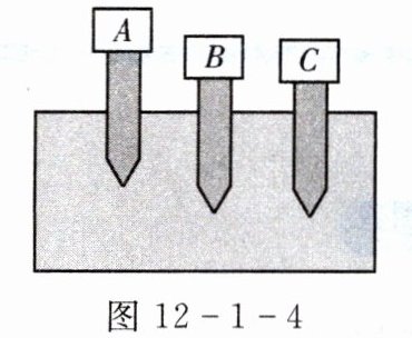 12. 探究“物体的重力势能大小与哪些因素有关”的实验中,三个相同的木桩被从空中静止释放的铁块撞击,陷入沙坑中的情况如图12-1-4所示。在此实验中,我们是通过观察什么来比较各铁块重力势能的大小?
