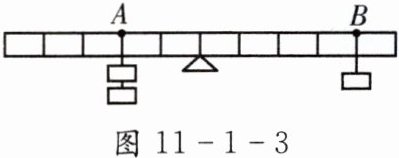 7. 如图11-1-3所示,一均匀杠杆A处挂2个钩码,B处挂1个钩码,杠杆恰好平衡,若每个钩码质量均为50g,若在A、B两处再各加一个钩码,则(