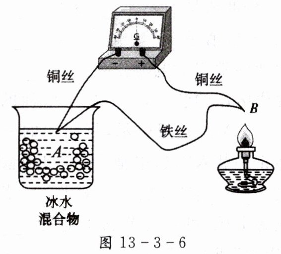 把两种不同材料的导线(如铁线和铜线)组成如图所示的闭合回路,当AB两端存在温度差时,回路中就会有电流通过,这就是塞贝克效应,这种电路叫作热电偶。实验表明:热电偶电路中电流的大小跟相互连接的两种金属丝的材料有关;跟接点A和B间温度差的大小有关,温度差越大,回路电流越大。请回答下列问题。