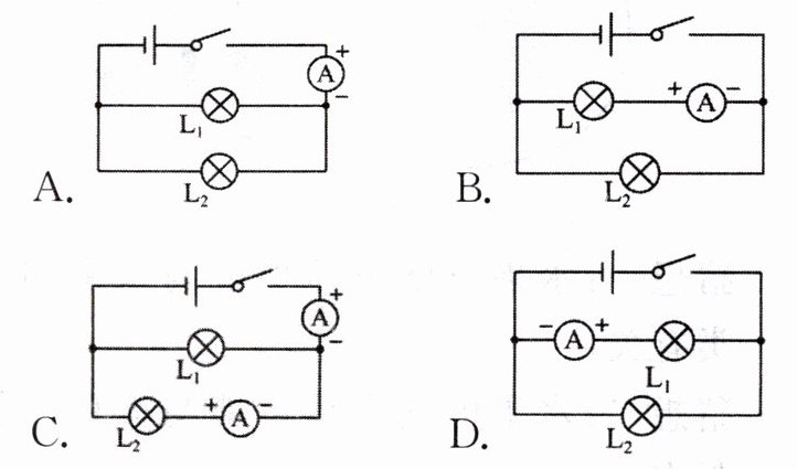 7. 如图中,能直接测量通过灯$L_1$电流的电路是(