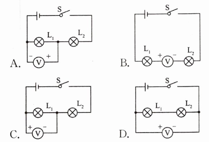 8. 如图所示,用电压表测灯泡$L_1$两端的电压,下列接法正确的是(