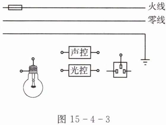 14. 居民楼的楼道里,夜间楼道灯一直亮着会造成浪费。科研人员用“光敏”材料制成“光控开关”,它能在天黑时自动闭合,天亮时自动断开;利用“声敏”材料制成“声控开关”,它能在有人走动发出声音时闭合,无人走动时自动断开。请将图15-4-3的“光控开关”“声控开关”、灯泡用笔画线代替导线正确连入电路,设计出只有在夜间且有声音时灯才亮的楼道灯自动控制电路,同时安装一个不受开关控制的三孔插座。