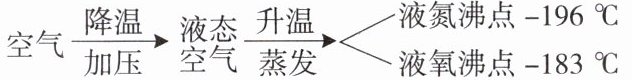 空气$\xrightarrow[加压]{降温}液态空气\xrightarrow[蒸发]{升温}$$\begin{cases} 液氮沸点-196\ \celsius \\ 液氧沸点-183\ \celsius \end{cases}\celsius $