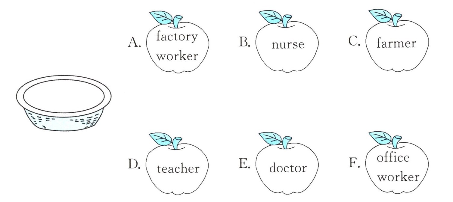 一、听录音,将你听到的职业序号放进小筐里。