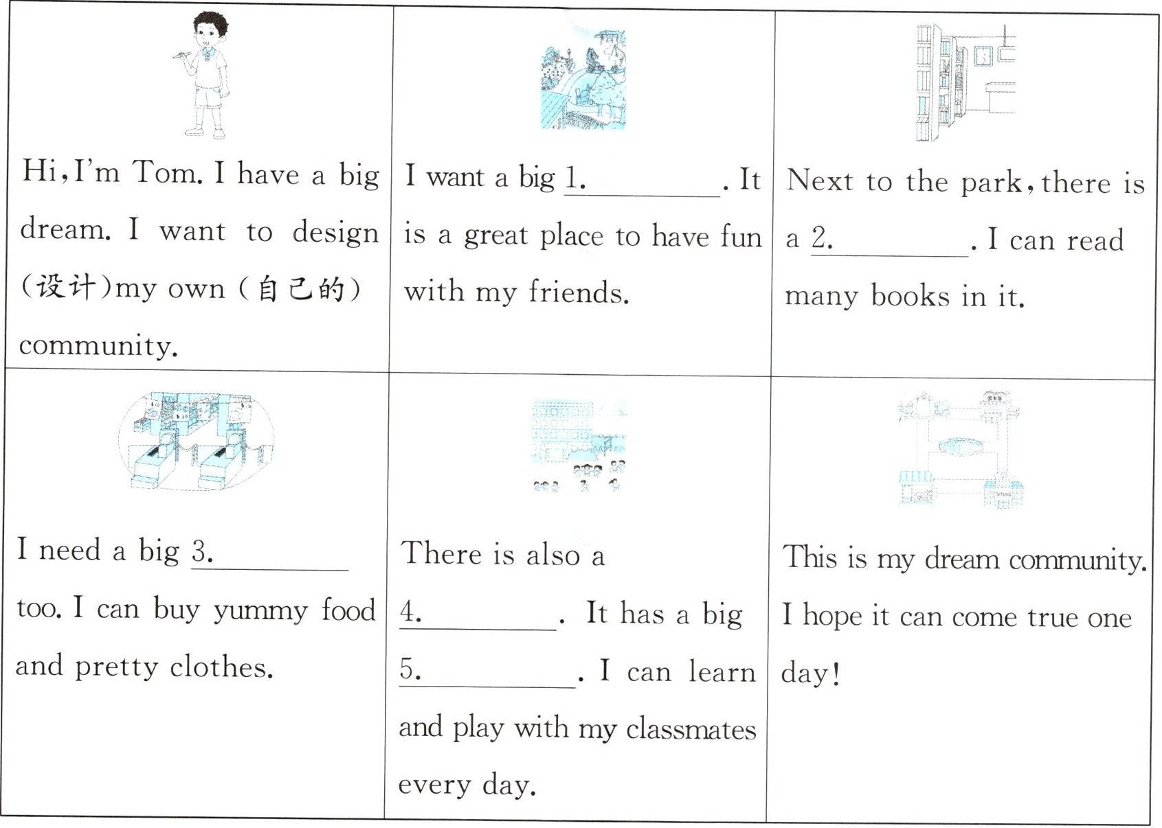 . I can learn and play with my classmates every day.|This is my dream community. I hope it can come true one day!|A. playground B. park C. school D. shop E. library