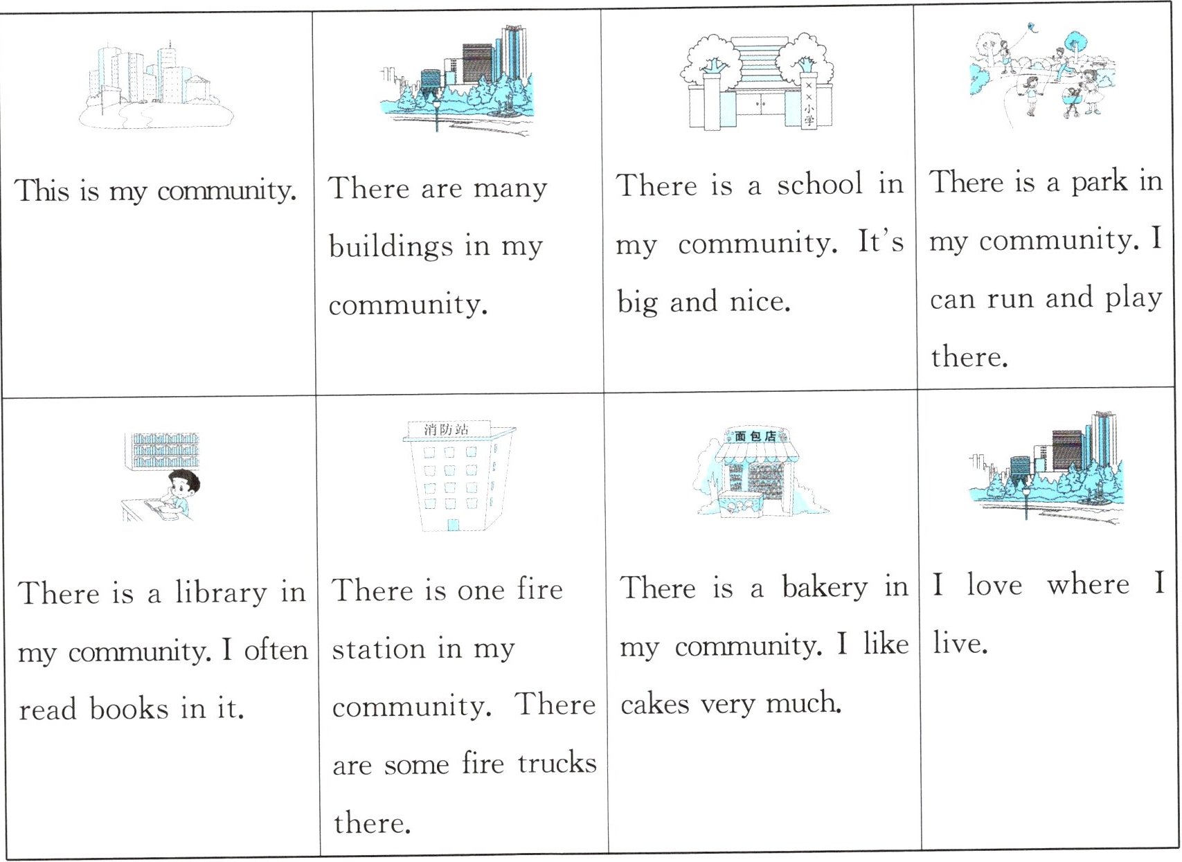 |This is my community.|There are many buildings in my community.|There is a school in my community. It's big and nice.|There is a park in my community. I can run and play there.|