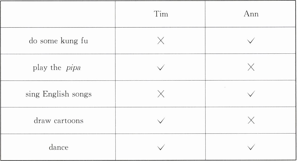 We will have an English party next week. Tim can play the pipa, draw cartoons and dance. But he can't do any kung fu or sing English songs. Ann can dance, too. But she can't play the pipa or draw cartoons. Ann can do some kung fu and sing English songs for the party.