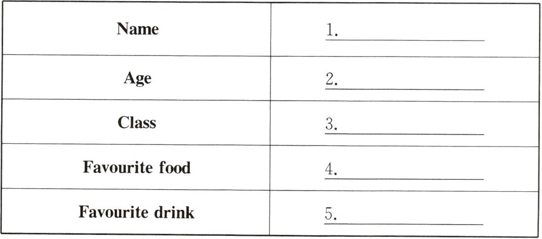 1. Mike 2. 11 3. 2 4. fish 5. milk
