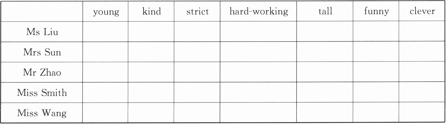 | | young | kind | strict | hard - working | tall | funny | clever |