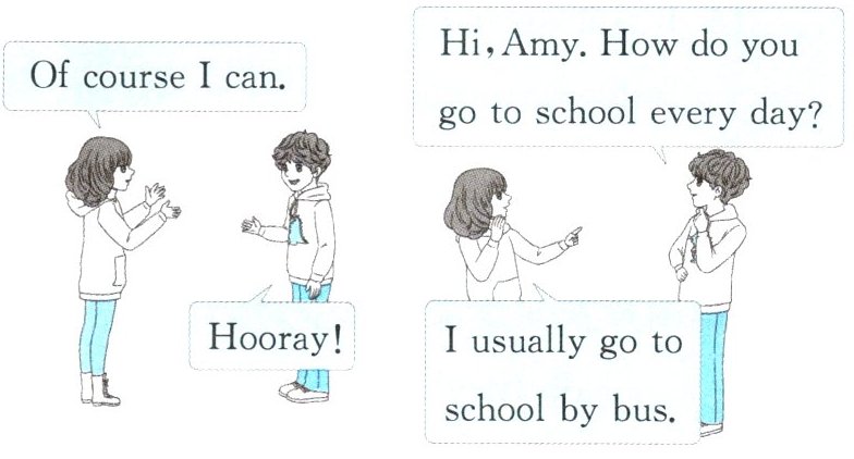 三、Mike 和 Amy 正在谈论每天上学的交通方式及周日去自然公园的事。按照正确的对话顺序将图片按 1~4 排序。