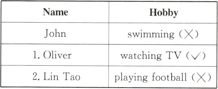 1. A:Does Oliver like watching TV? B:Yes,he does. 2. A:Does Lin Tao like playing football? B:No,he doesn't.
