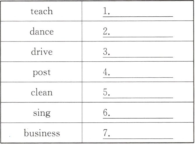 1. teacher 2. dancer 3. driver 4. postman/postwoman 5. cleaner 6. singer 7. businessman/businesswoman