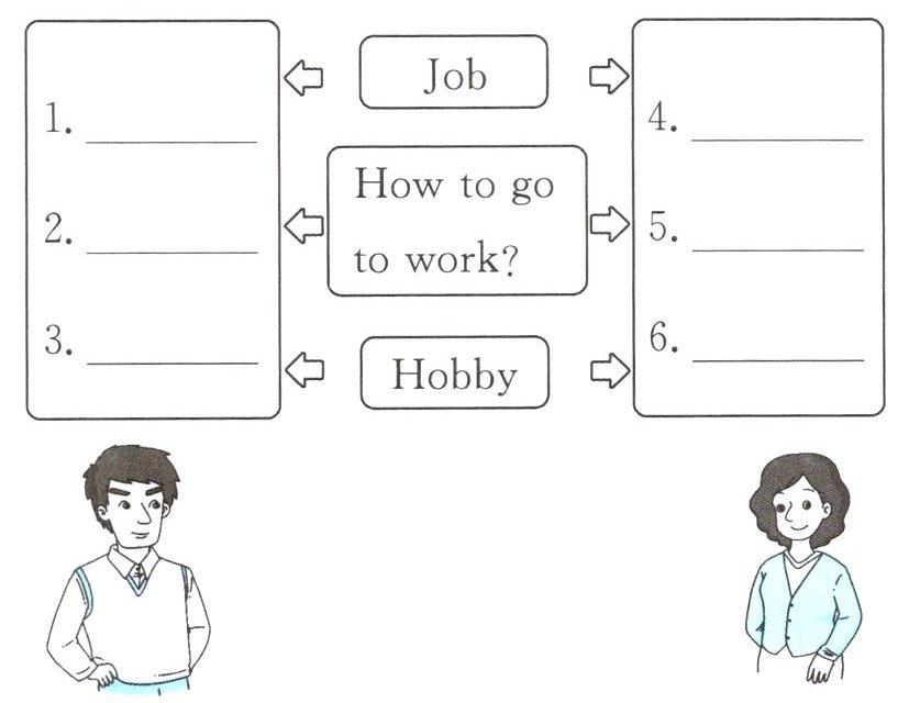 1. a businessman 2. by car 3. swimming 4. a teacher 5. on foot 6. reading books