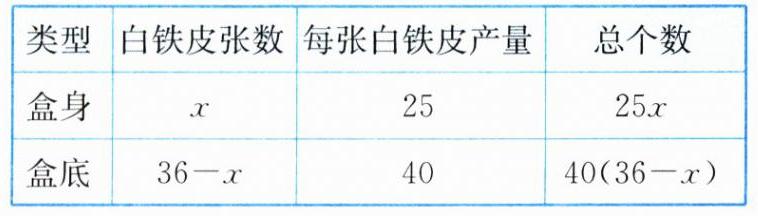 (2)两个相等关系:一个用于设未知数,另一个用于列方程。如例 1 中,一个是“制作盒身的白铁皮张数 + 制作盒底的白铁皮张数 = 36”,此关系用来设未知数;另一个是“制成的盒身数与盒底数成倍数关系”,用此关系可列出方程。