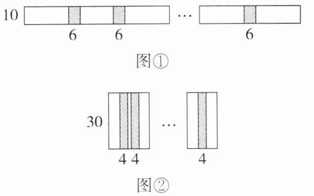 已知剪下的小纸条长 30 cm,宽 10 cm,两人采用不同的黏合方法。小云把小纸条的宽边黏合起来,黏合长度为 6 cm,得到如图①(示意图)所示的大长方形;小悦把小纸条的长边黏合起来,黏合长度为 4 cm,得到如图②(示意图)所示的大长方形。