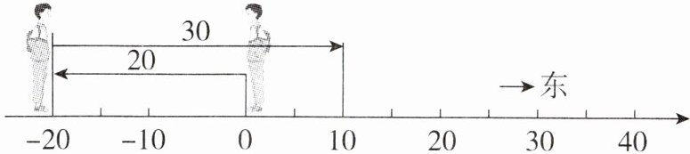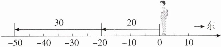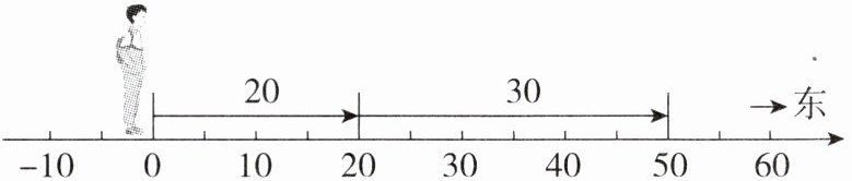 如图,若第一次向东走 20 m,第二次又向东走 30 m,两次运动后在出发点的什么方向?与出发点相距多少米?如何用算式表示?