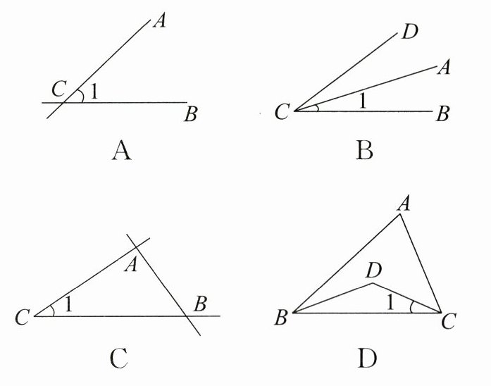 2. 下列图形中,能用$∠1,∠ACB,∠C$三种方法表示同一个角的是 (