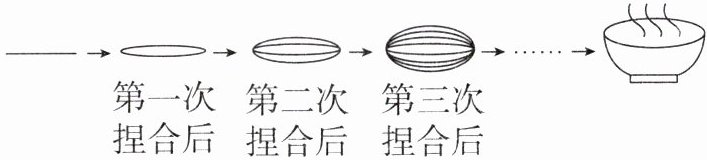 3. 你喜欢吃拉面吗?拉面馆的师傅,用一根很粗的面条,把两头捏合在一起拉伸,再捏合,再拉伸,反复几次,就把这根很粗的面条拉成了许多根细的面条.如图所示.