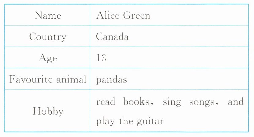 Alice's full name is Alice Green. She comes from Canada. She is thirteen years old now. Alice likes pandas very much. She thinks they are very cute. She wants to come to China to see pandas. In her free time, Alice loves reading books at home. She also likes singing songs and playing the guitar. Alice is really nice. I like her. I'm glad to have her as my friend.