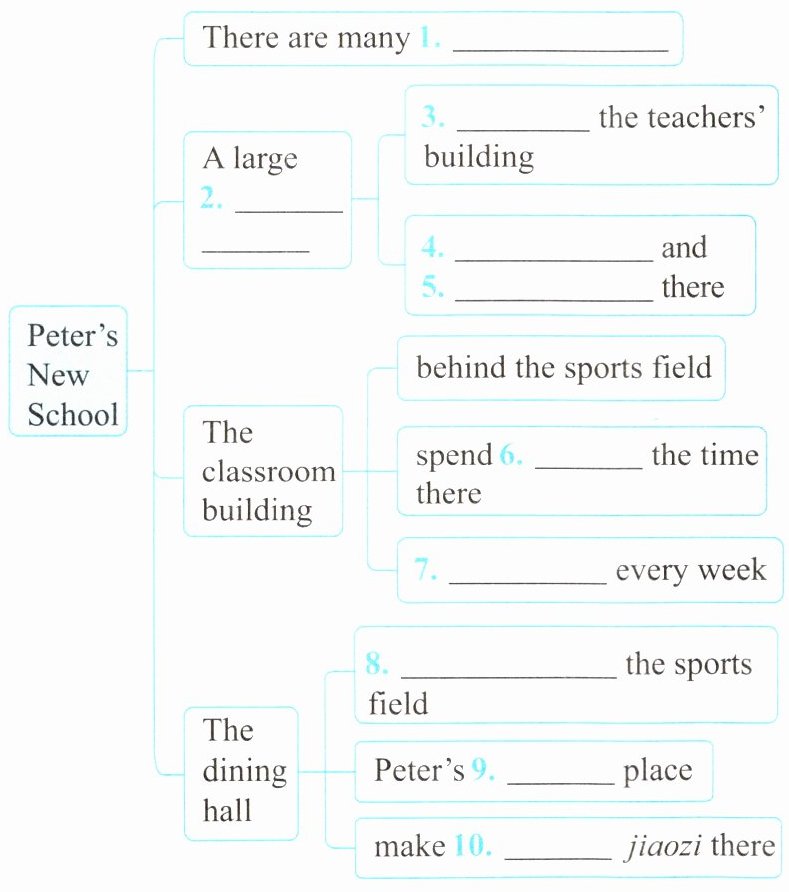 1. modern buildings 2. sports field 3. next to 4. do exercises 5. raise the flag 6. most of 7. change seats 8. across from 9. favourite 10. delicious