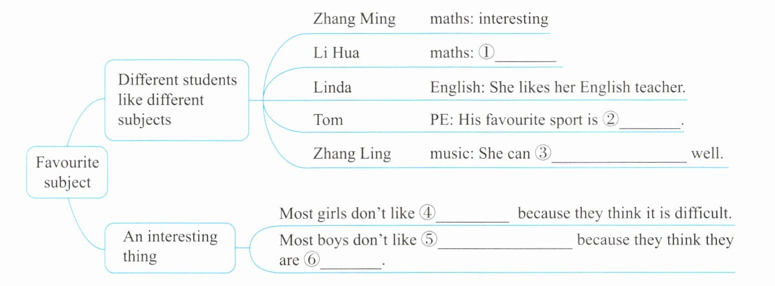 Zhang Ming likes maths best and he thinks it is interesting. Li Hua also likes maths but she thinks it is a little difficult. Linda’s favourite subject is English because she likes her English teacher, Miss Green. Tom likes PE best and his favourite sport is basketball. He is on the school basketball team. Zhang Ling’s favourite subject is music. She can play the piano well and she is in the school music club. She’s often in the school music festival.