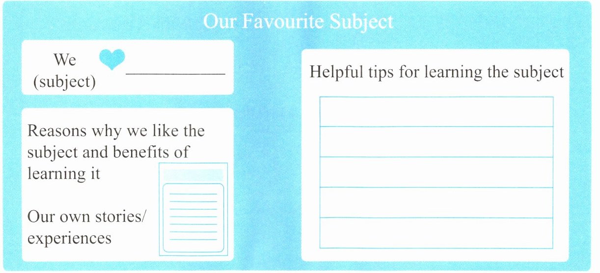 任务情境:和组员一起完成一个展示板,展示一下你们喜欢的学科。其中可以包含你们喜欢的学科、喜欢的理由及学习收获、个人学习经历,并且给其他同学一些学习这门学科的小贴士。展示板可以参考下图: