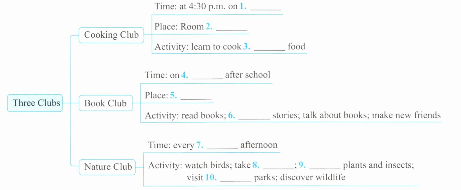 1. Wednesdays 2. 303 3. Chinese 4. Tuesdays 5. the library 6. act out 7. Sunday 8. photos 9. collect 10. nature