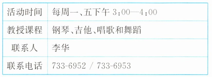 Do you love music? Can you play the piano and the guitar? Can you sing and dance? Come and join our music club! I'm sure you'll be happy in the club. We have lessons about piano and guitar from 3:00 to 4:00 every Monday and Friday afternoon. We can also teach you to sing and dance. You can make a lot of friends in our club too. It's relaxing and interesting! If you want to join us, please call Li Hua at 733-6952 or 733-6953.